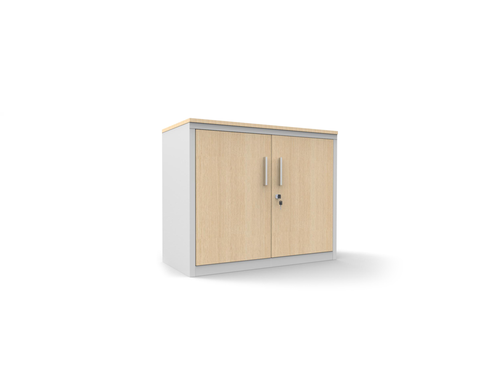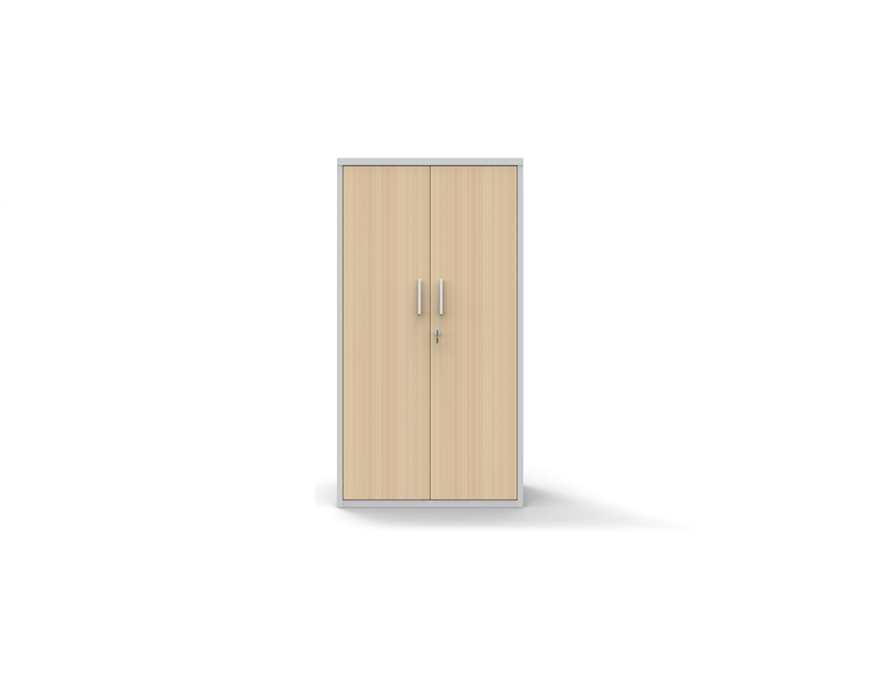 Extrutura metálica, com portas de bater e acabamentos em melamina.