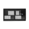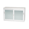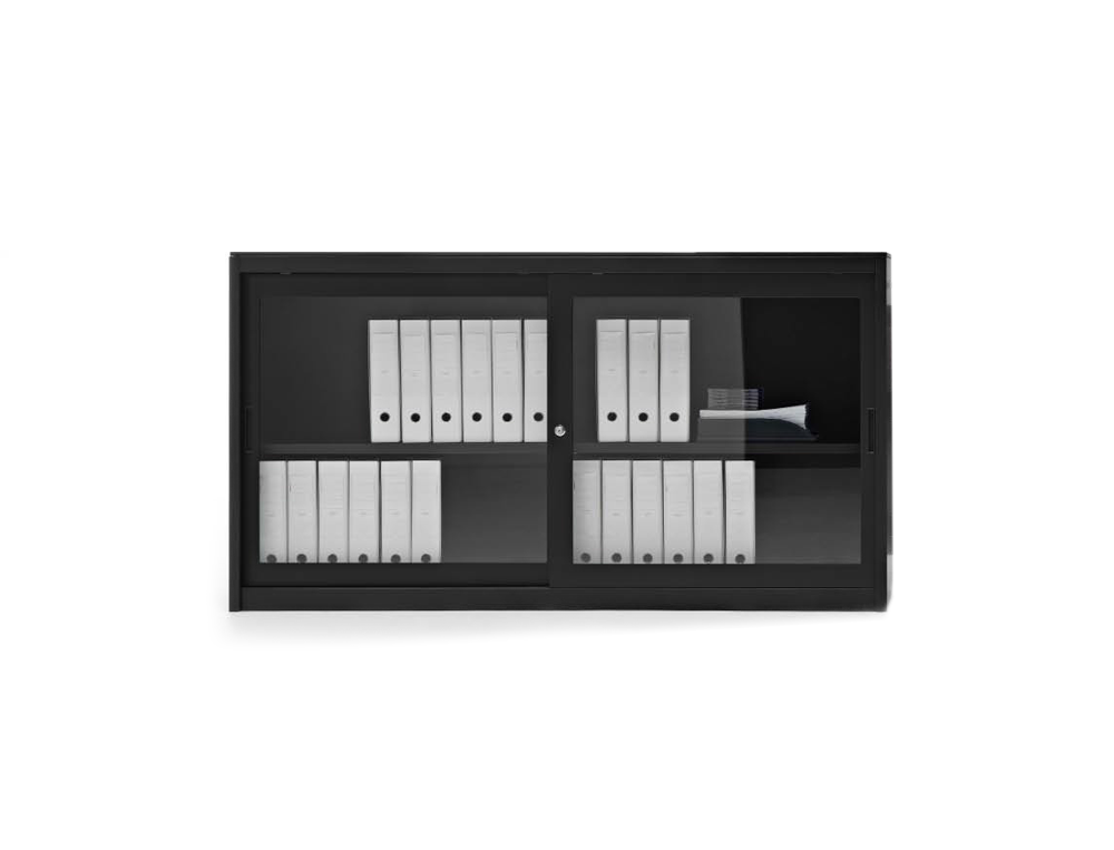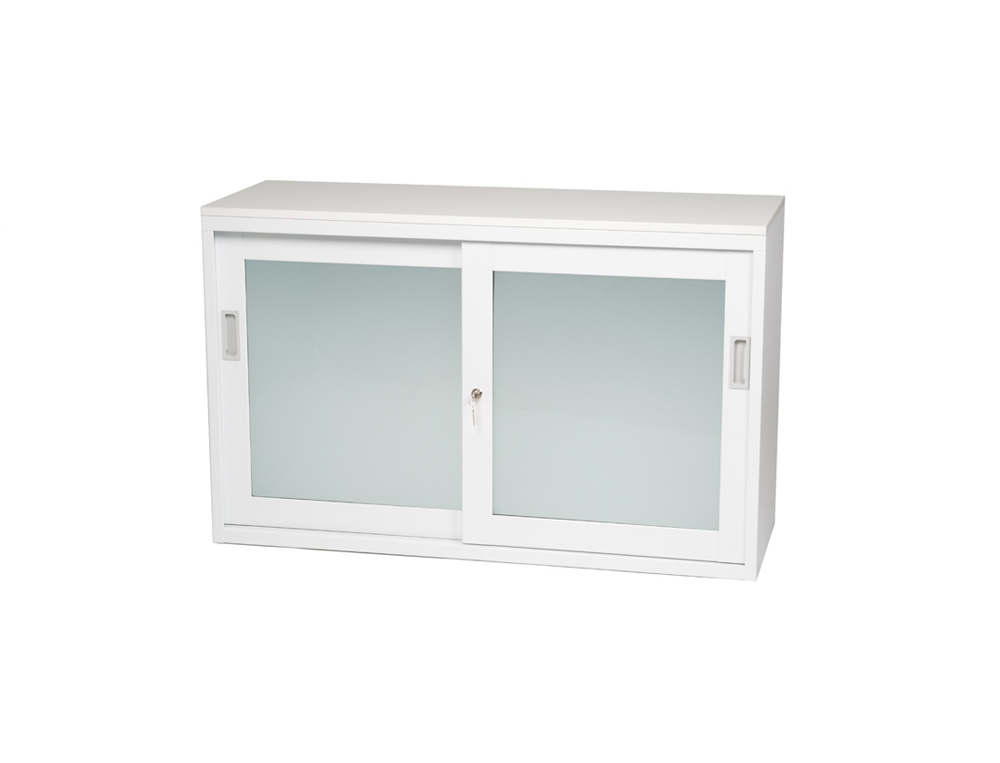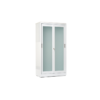 Extrutura metálica, com portas em vidro e acabamento em melamina.